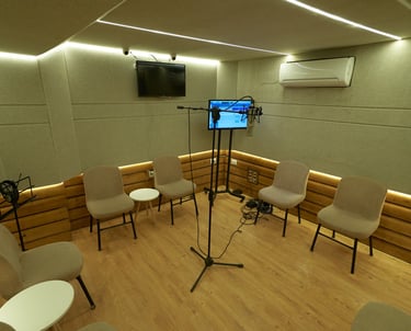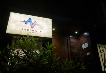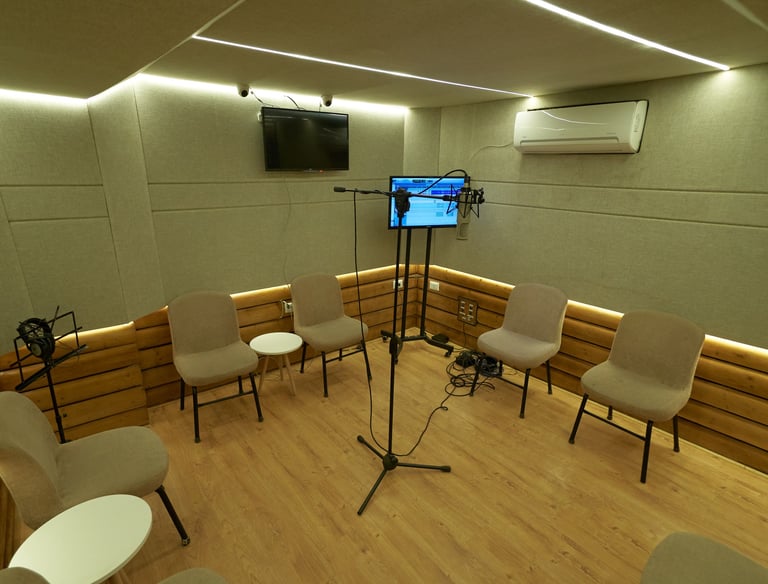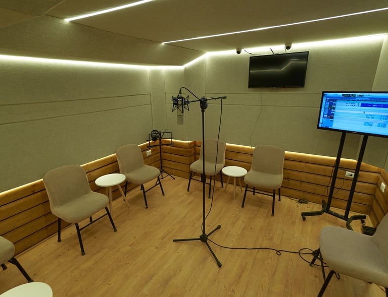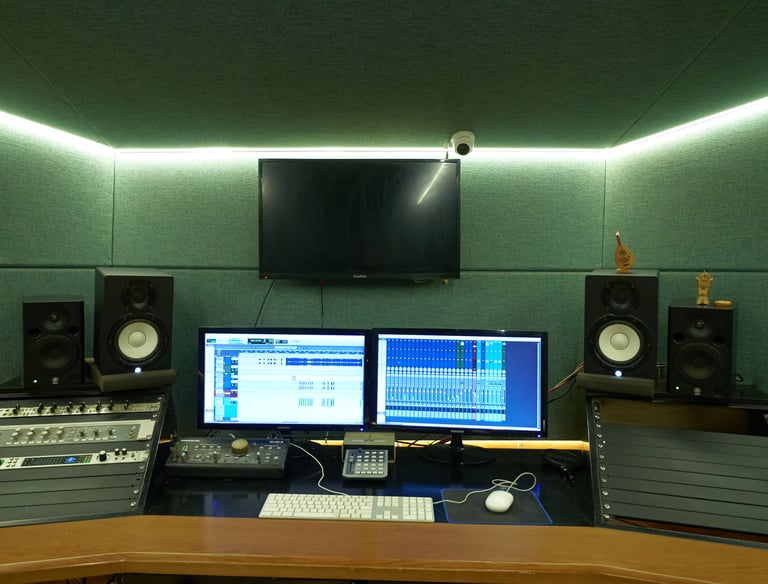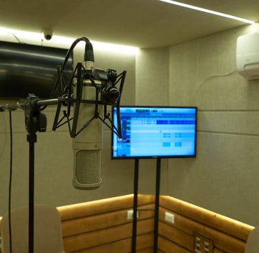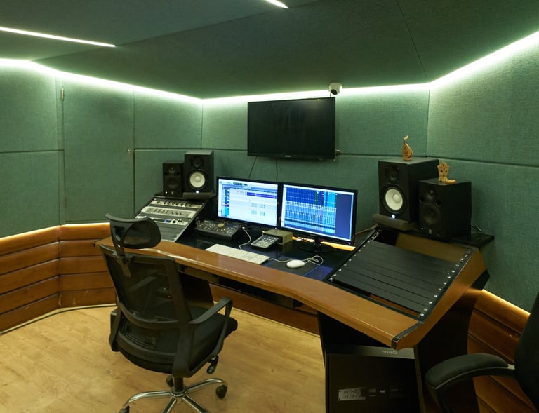 A modern recording studio with dedicated tracking rooms. Capture your sound with pristine quality in our acoustically isolated Recording Room. Ideal for vocals, instruments, and ensemble tracking.